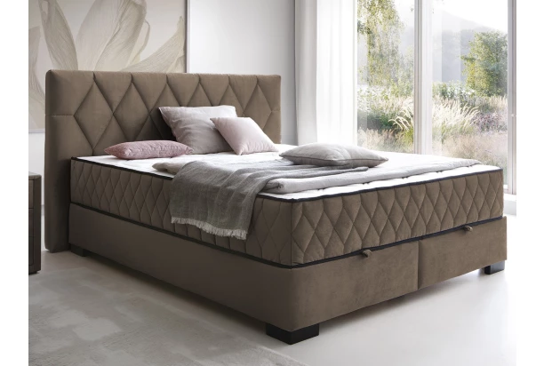 Krásná manželská postel o velikosti lůžka 180×200 cm zaujme stylovým proševem a v prostoru ložnice působí velmi luxusně. Postel je očalouněna odolnou látkou v optice lesklého sametu v odstínu světle hnědá. O pohodlí spánku se postarají kvalitní vysoké matrace s taštičkovým jádrem, které zajistí optimální komfort během spaní. Díky vyšší poloze lůžka je tak vstávání z postele snazší. Praktický úložný prostor ve spodní části postele je snadno přístupný z přední strany postele a poslouží například pro uschování lůžkovin anebo sezónních věcí.