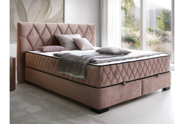 Krásná manželská postel o velikosti lůžka 160×200 cm zaujme stylovým proševem a v prostoru ložnice působí velmi luxusně. Postel je očalouněna odolnou látkou v optice lesklého sametu v odstínu tmavě růžová. O pohodlí spánku se postarají kvalitní vysoké matrace s taštičkovým jádrem, které zajistí optimální komfort během spaní. Díky vyšší poloze lůžka je tak vstávání z postele snazší. Praktický úložný prostor ve spodní části postele je snadno přístupný z přední strany postele a poslouží například pro uschování lůžkovin anebo sezónních věcí.