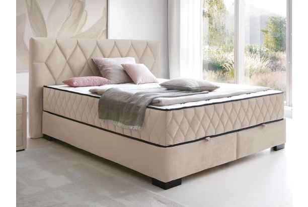 Krásná manželská postel o velikosti lůžka 160×200 cm zaujme stylovým proševem a v prostoru ložnice působí velmi luxusně. Postel je očalouněna odolnou látkou v optice lesklého sametu v odstínu krémová. O pohodlí spánku se postarají kvalitní vysoké matrace s taštičkovým jádrem, které zajistí optimální komfort během spaní. Díky vyšší poloze lůžka je tak vstávání z postele snazší. Praktický úložný prostor ve spodní části postele je snadno přístupný z přední strany postele a poslouží například pro uschování lůžkovin anebo sezónních věcí.