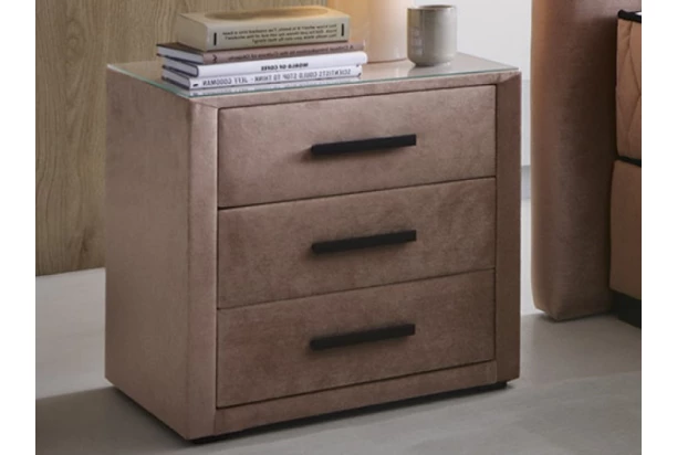 Vysoký noční stolek se 3 zásuvkami působí v prostoru ložnice působí velmi luxusně. Stolek je očalouněn odolnou látkou v optice lesklého sametu v odstínu tmavě růžová. Horní plocha je pokryta čirým bezpečnostním sklem, které chrání horní povrch stolku a umožňuje snadnou údržbu. Tento noční stolek se dokonale hodí pro umístění k posteli s vyšší polohou lůžka.