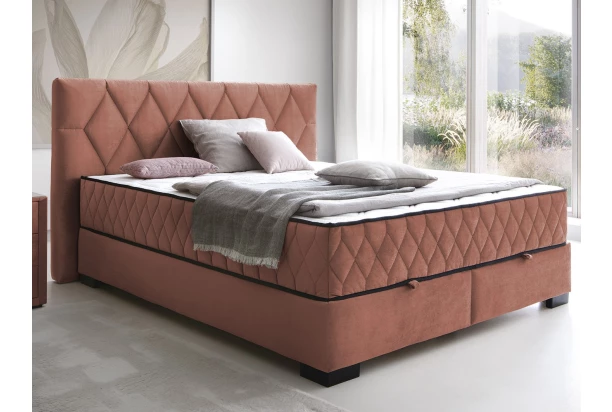 Krásná manželská postel o velikosti lůžka 180×200 cm zaujme stylovým proševem a v prostoru ložnice působí velmi luxusně. Postel je očalouněna odolnou látkou v optice lesklého sametu v odstínu lososová. O pohodlí spánku se postarají kvalitní vysoké matrace s taštičkovým jádrem, které zajistí optimální komfort během spaní. Díky vyšší poloze lůžka je tak vstávání z postele snazší. Praktický úložný prostor ve spodní části postele je snadno přístupný z přední strany postele a poslouží například pro uschování lůžkovin anebo sezónních věcí.