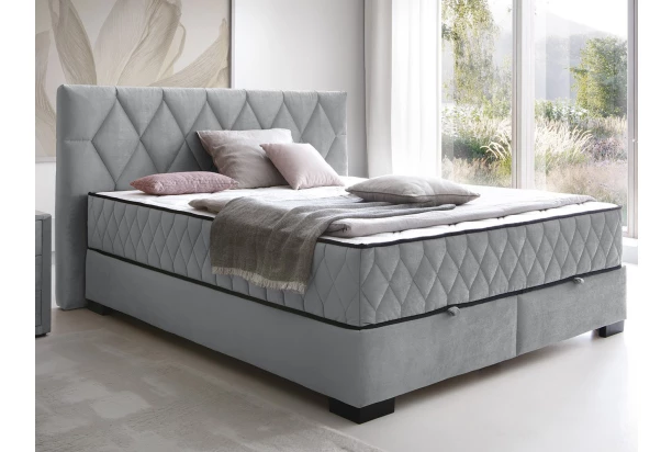 Krásná manželská postel o velikosti lůžka 180×200 cm zaujme stylovým proševem a v prostoru ložnice působí velmi luxusně. Postel je očalouněna odolnou látkou v optice lesklého sametu v odstínu světle šedá. O pohodlí spánku se postarají kvalitní vysoké matrace s taštičkovým jádrem, které zajistí optimální komfort během spaní. Díky vyšší poloze lůžka je tak vstávání z postele snazší. Praktický úložný prostor ve spodní části postele je snadno přístupný z přední strany postele a poslouží například pro uschování lůžkovin anebo sezónních věcí.
