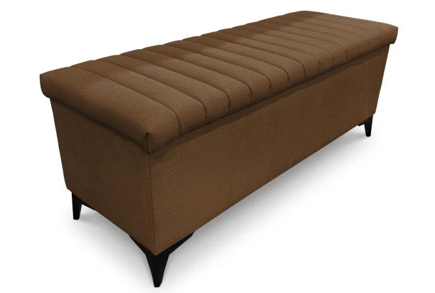 Trendy úložná lavice/peřiňák se skvěle hodí nejen do moderní ložnice, ale i obýváku nebo předsíně. Lavice je očalouněna sametově hebkou látkou v odstínu whiskey hnědá, která je zároveň i velmi odolná. Konstrukce na černých nožkách umožňuje snazší udržbu podlahy. Pod výklopným sedákem najdete dostatek prostoru pro uložení lůžkovin, příkrývek anebo věcí sezónní potřeby.