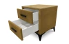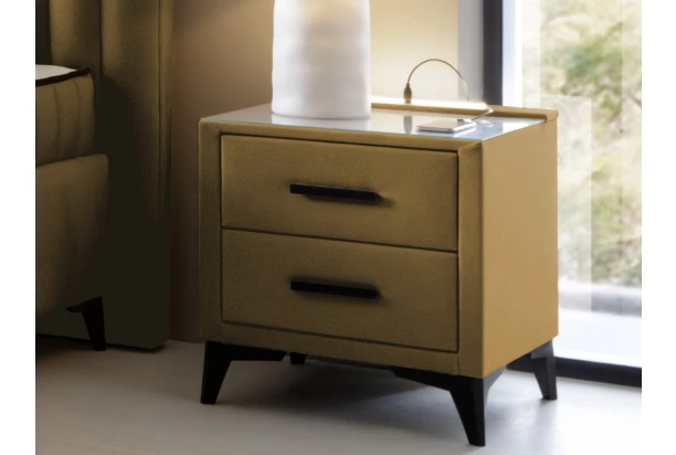 Trendy noční stolek se 2 zásuvkami se skvěle hodí do moderní ložnice. Stolek je očalouněn sametově hebkou látkou v odstínu hořčicově žlutá, která je zároveň i velmi odolná. Zvýšená konstrukce stolku na černých nožkách je ideální pro umístění k vyššímu lůžku, zároveň umožňuje snazší udržbu podlahy. Horní plocha nočního stolku je navíc opratřena čirým bezpečnostním sklem, které prakticky chrání jeho povrch.