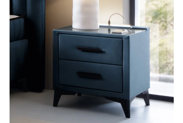 Trendy noční stolek se 2 zásuvkami se skvěle hodí do moderní ložnice. Stolek je očalouněn sametově hebkou látkou v odstínu námořnická modrá, která je zároveň i velmi odolná. Zvýšená konstrukce stolku na černých nožkách je ideální pro umístění k vyššímu lůžku, zároveň umožňuje snazší udržbu podlahy. Horní plocha nočního stolku je navíc opratřena čirým bezpečnostním sklem, které prakticky chrání jeho povrch.