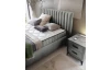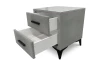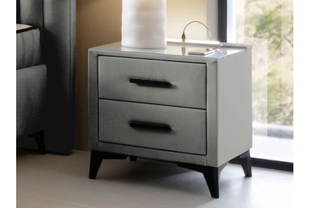 Trendy noční stolek se 2 zásuvkami se skvěle hodí do moderní ložnice. Stolek je očalouněn sametově hebkou látkou v odstínu světle šedá, která je zároveň i velmi odolná. Zvýšená konstrukce stolku na černých nožkách je ideální pro umístění k vyššímu lůžku, zároveň umožňuje snazší udržbu podlahy. Horní plocha nočního stolku je navíc opratřena čirým bezpečnostním sklem, které prakticky chrání jeho povrch.