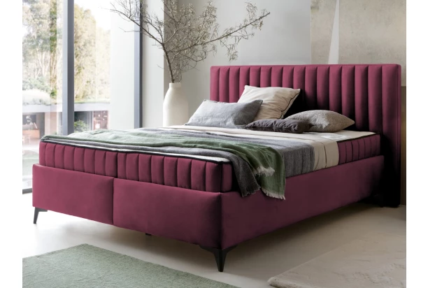 Trendy manželská postel o velikosti lůžka 180×200 cm má stylové prošití potahu ve vertikálním směru a skvěle se hodí do moderní ložnice. Postel je očalouněna sametově hebkou látkou v odstínu tmavě růžová malina, která je zároveň i velmi odolná. Toto dvoulůžko obsahuje kvalitní vysoké matrace s taštičkovým jádrem a studenou pěnou, které zajistí optimální komfort během spaní. Díky vyšší poloze lůžka se vám bude z postele lépe vstávat. Ve spodní části postele najdete praktické úložné prostory, ke kterým se snadno dostanete z bočních stran. Do úložných prostor můžete ukládat například lůžkoviny, deky nebo některé sezónní věci. Postel je na nožkách, tudíž můžete využívat během úklidu i robotický vysavač, což je velmi praktické.
