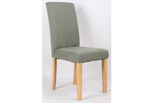 Elegantní jídelní židle s vyšším opěradlem je očalouněna látkou v barvě rákosově zelená a doplněna okrasným prošitím na zadní straně opěradla. Nohy z masivního dřeva působí útulně v interieru jídelny.