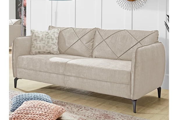 Elegantní trojmístná pohovka s pohodlným vypolstrováním a opěrnými polštáři se hodí do každého obýváku. Trojsedák je očalouněn jemně strukturovanou žinilkovou látkou v barvě světle béžová a doplněn vzorovaným polštářkem. Černé kovové nožky působí v interieru vzdušně a usnadní vám údržbu podlahy.