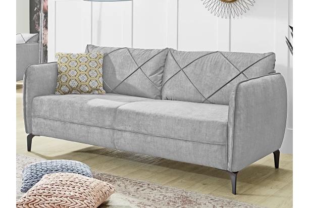 Elegantní trojmístná pohovka s pohodlným vypolstrováním a opěrnými polštáři se hodí do každého obýváku. Trojsedák je očalouněn kvalitní velurovou látkou v barvě šedá a doplněn vzorovaným polštářkem. Černé kovové nožky působí v interieru vzdušně a usnadní vám údržbu podlahy.