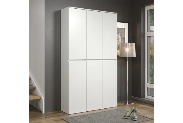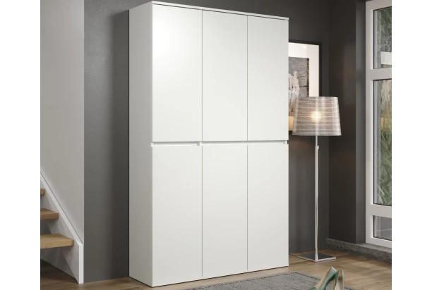 Víceúčelová skříň o šířce 111 cm v bílé barvě má moderní minimalistický design a působí zcela nadčasově. Za 6 otočnými dveřmi najdete velmi praktické úložné prostory s šatní tyčí a mnoha policemi, které můžete libovolně výškově nastavovat a přizpůsobit si tak vnitřní prostor podle potřeby. Tato skříň se tak univerzálně hodí nejen do předsíně jako předsíňová šatní skříň anebo jako velký botník, ale také například do ložnice, domácí pracovny, šatny nebo komory, kde díky mnoha vnitřním přihrádkám velmi dobře poslouží pro jakékoliv přehledné ukládání věcí. Navíc můžete vedle sebe kombinovat i více skříní z řady Nevada a Mirror najednou a získat tak opravdu skvělé praktické prostředí pro multifunkční ukládání.