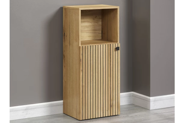 Univerzální skříňka nejen do koupelny z kolekce Pure Bliss – moderní nábytek zaujme frézovanými čelními plochami v lamelové optice a útulným dřevodekorem dub evoke. Za otočnými dvířky najdete úložný prostor s poličkou. Do otevřené přihrádky můžete snadno odkládat např. ručníky, osušky nebo třeba kosmetické potřeby. Šířka 40 cm.