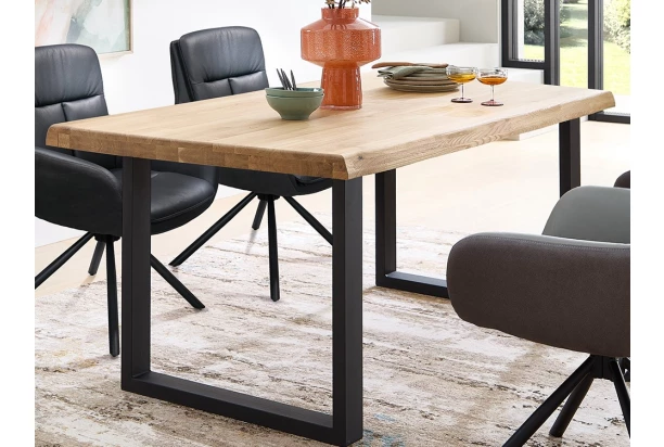 Jídelní stůl z masivního dubového dřeva o velikosti 160×90 cm je originálním spojením přírodní krásy a moderního designu. Dominantním prvkem jsou záměrně zvlněné hrany stolové desky, které podtrhují přirozenost dřeva a díky kterým vynikne efekt masivity. Jídelní stůl je usazen na robustní černé kovové podnoži ve tvaru písmene U, která stolu dodává moderní industriální nádech. Kovová konstrukce zajišťuje vysokou stabilitu a pevnost, takže stůl obstojí při každodenním používání i při větších rodinných setkáních. Spojení zvlněných přírodních hran, masivního dubu a pevné kovové podnože vytváří harmonický kontrast mezi surovostí přírody a čistotou moderního designu. Tento stůl se stane výrazným a nadčasovým centrem každé jídelny.