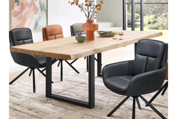 Jídelní stůl z masivního dubového dřeva o velikosti 240×100 cm je originálním spojením přírodní krásy a moderního designu. Dominantním prvkem jsou záměrně zvlněné hrany stolové desky, které podtrhují přirozenost dřeva a díky kterým vynikne efekt masivity. Jídelní stůl je usazen na robustní černé kovové podnoži ve tvaru písmene U, která stolu dodává moderní industriální nádech. Kovová konstrukce zajišťuje vysokou stabilitu a pevnost, takže stůl obstojí při každodenním používání i při větších rodinných setkáních. Spojení zvlněných přírodních hran, masivního dubu a pevné kovové podnože vytváří harmonický kontrast mezi surovostí přírody a čistotou moderního designu. Tento stůl se stane výrazným a nadčasovým centrem každé jídelny.