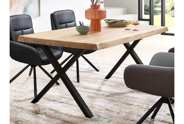 Jídelní stůl z masivního dubového dřeva o velikosti 160×90 cm je originálním spojením přírodní krásy a moderního designu. Dominantním prvkem jsou záměrně zvlněné hrany stolové desky, které podtrhují přirozenost dřeva a díky kterým vynikne efekt masivity. Jídelní stůl je usazen na robustní černé kovové podnoži ve tvaru písmene X, která stolu dodává moderní industriální nádech. Kovová konstrukce zajišťuje vysokou stabilitu a pevnost, takže stůl obstojí při každodenním používání i při větších rodinných setkáních. Spojení zvlněných přírodních hran, masivního dubu a pevné kovové podnože vytváří harmonický kontrast mezi surovostí přírody a čistotou moderního designu. Tento stůl se stane výrazným a nadčasovým centrem každé jídelny.