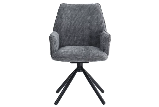 Otočná jídelní židle na černé kovové podnoži má moderní design a pohodlně tvarovaný sedák, který je očalouněn příjemně měkkou strukturovanou tkaninou v barvě kouřově šedá. Tato židle skvěle vynikne v moderně zařízeném bytě.