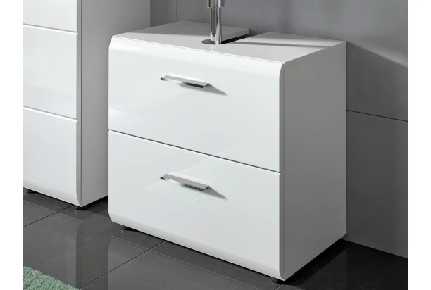Koupelnová skříňka pod umyvadlo z programu Ice – čistě bílý nábytek s lesklými předními plochami a elegantním zaoblením hran působí nadčasově a je zcela univerzální pro vybavení každé moderní koupelny. Skříňka pro umístění pod umyvadlo obsahuje dvě zásuvky, do kterých můžete přehledně uložit ručníky, kosmetiku i věci pro domácí úklid. Solidní zpracování a materiály jsou vhodné pro používání ve vlhkém prostředí koupelny, což zaručuje dlouhou životnost, povrchy nábytku se navíc snadno udržují a čistí. Tato bílá skříňka se hodí téměř do každé koupeny.