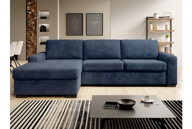 Komfortní rohová sedačka je vybavena kvalitním rozkládacím mechanismem s matrací o velikosti 140×191 cm pro trvalé spaní, kde najde pohodlí jedna až dvě osoby. Na útulnosti přidává i měkoučká potahová látka s proužkovanou strukturou v odstínu královská modrá. Sedací souprava s rozkladem je ideální také do menších bytů, kde může posloužit jako plnohodnotné lůžko. Díky snadnému rozložení se sedačka promění v postel během pár vteřin.