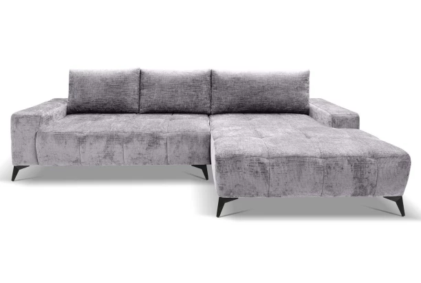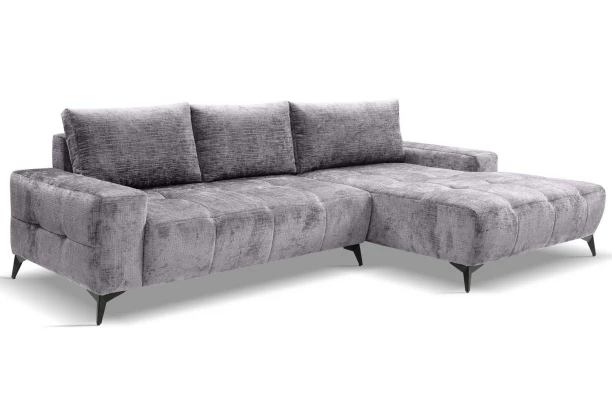 Moderní rohová sedačka je prostorná a má komfortně měkké sezení. Sedačka s otomanem tvoří pravý roh a je očalouněna měkkou strukturovanou látkou se sametově lesklým efektem v barvě holubí šedá – atraktivní potahová látka navíc působí luxusně. Zaujme stylovým proševem sedáku i bočních područek. Černé kovové nohy v moderním designu usnadní údržbu podlahy pod sedačkou. Rohová sedací souprava je vybavena rozkládací funkcí a praktickým úložným prostorem pod sedákem, kam můžete ukládat například deky nebo věci sezónní potřeby.