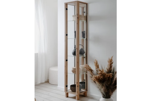 Vysoká a zároveň úzká vitrína v dekoru dub artisan o šířce 33 cm má skleněné dveře i boční strany – nabízí vám tak prostor pro velkolepé vystavení vašich oblíbených předmětů, dekorací, fotek, šperků nebo třeba oblíbeného jídelního servisu. Vnitřní zádová plocha vitríny je vybavena zrcadlem, které vytváří luxusní efekt a zároveň opticky zvětšuje okolní prostor. Vnitřní prostor je vybaven policemi ze skla a dveře vitríny lze univerzálně namontovat jako pravé anebo levé – vitrínu si tak snadno přizpůsobíte podle vašich potřeb. Vitrína má stabilní konstrukci a zároveň působí v interieru vzdušným dojmem. Tato vitrína skvělě doplní například obývací pokoj, jídelnu anebo třeba chodbu, kde upoutá na pohled.