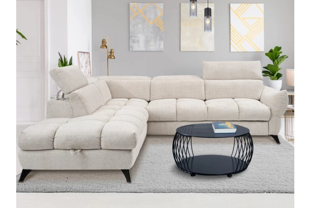 Atraktivní rohová sedačka má elegantně zaoblené tvary s výrazným prošitím, které vytváří nadýchanou polštářovou optiku. Komfortně měkké sezení doplňují zádové opěrky s funkcí polohování podle vaší aktuální potřeby, snadno si tak kdykoliv přizpůsobíte pohodlí podle sebe. Moderní kovové černé nohy dotváří moderní design a působí vzdušným dojmem. Rohová sedací souprava nabízí i funkci rozkladu pro příležitostné spaní a navíc úložný prostor pod otomanem. Tato kvalitně vypolstrovaná sedačka s otomanem tvoří levý roh a je očalouněna měkkou strukturovanou látkou v barvě šedo-krémová, která je kombinací estetiky, pohodlí a funkčnosti – tato látka je nejen příjemně měkká na dotek, ale zároveň i Pet friendly – tedy odolná vůči poškrábání a jinému mechanickému poškození, což z ní činí ideální volbu pro majitele domácích mazlíčků.