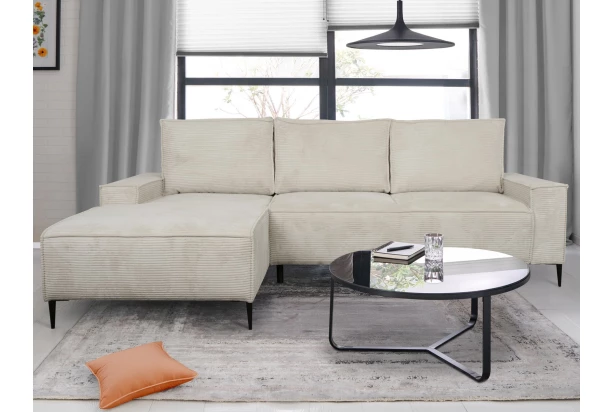 Trendová rohová sedačka na černých nohách tvoří levý roh a svými rozměry pasuje dobře i do malého obýváku. Pohodlné sezení doplňují polštáře i měkkoučká strukturovaná látka v barvě krémová. Oceníte rozkládací funkci na příležitostné spaní a také úložný prostor. Sedací souprava umožňuje díky vyšší podnoži snadnou údržbu podlahy a případně i možnost využití robotického vysavače. Tato rozměrově menší sedačka se skvěle hodí do moderního obýváku a díky měkkoučké látce doplní útulnou atmosféru uvnitř bytu.
