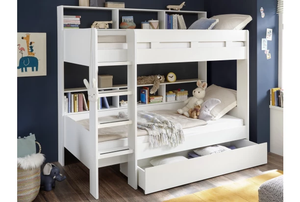 Dvoupatrová bílá postel o velikosti lůžka 90×200 cm má boční schůdky a se svým univerzálním designem hodí do každého pokoje. Praktický odkládací regál u horního i dolního lůžka poslouží pro odkládání knížek, budíku, psacích potřeb nebo dekorací.