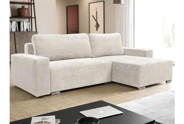 Pohodlná rozkládací sedačka v nadčasovém stylu pasuje do každého interieru a nabízí dostatek prostoru pro vaši každodenní pohodu. Rohová sedací souprava je čalouněna látkou s jemnou povrchovou strukturou v barvě světle krémová. Velké opěrné polštáře poskytují pohodlí a zároveň oporu, po jejich odejmutí můžete pohovku využít jako lůžko pro příležitostné spaní anebo relaxaci. Po sedákem najdete úložný prostor, kam můžete ukládat například deky nebo věci sezónní potřeby.