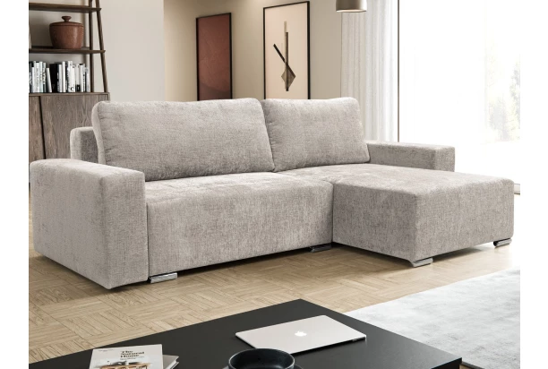 Pohodlná rozkládací sedačka v nadčasovém stylu pasuje do každého interieru a nabízí dostatek prostoru pro vaši každodenní pohodu. Rohová sedací souprava je čalouněna látkou s jemnou povrchovou strukturou v barvě světlá šedo-béžová. Velké opěrné polštáře poskytují pohodlí a zároveň oporu, po jejich odejmutí můžete pohovku využít jako lůžko pro příležitostné spaní anebo relaxaci. Po sedákem najdete úložný prostor, kam můžete ukládat například deky nebo věci sezónní potřeby.