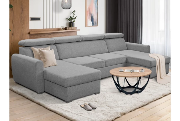 Pohodlná sedací souprava ve tvaru U se rozměrově hodí i do menšího obýváku, kde nabídne pohodlně měkké sezení s polohovatelnými opěrkami hlavy. Sedačka je očalouněna odolnou látkou v barvě holubí šedá a má dva otomany, na kterých můžete v pohodě relaxovat nebo sledovat televizi. Pod otomany najdete praktické úložné prostory. Funkci rozkladu pro příležitostné spaní využijete při odpočinku anebo třeba vaše víkendová návštěva.