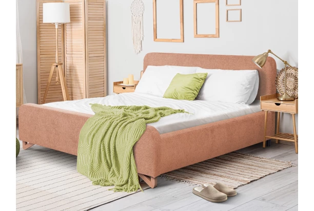 Elegantní postel o velikosti lůžka 180×200 cm má zaoblený tvar čela a zajímavé nohy z masivního dřeva, jež dotváří útulnou atmosféru v prostoru ložnice. Dvoulůžková postel má stabilní konstrukci a je očalouněna sametově hebkou strukturovanou tkaninou v barvě meruňková, která se zároveň vyznačuje zvýšenou odolností.