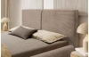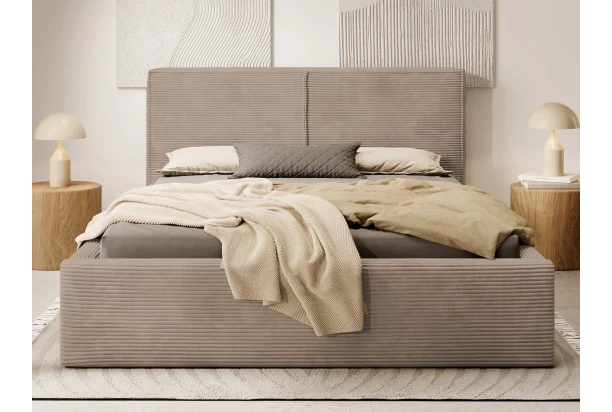 Postel o velikosti lůžka 180×200 cm je očalouněna měkkoučkou strukturovanou látkou v barvě světle hnědá, která působí velmi útulně. Čalounění zadního čela doplňují okrasné látkové lemy. Tato dvoulůžková postel má stabilní konstrukci a svým moderním stylem se hodí téměř do každé ložnice.