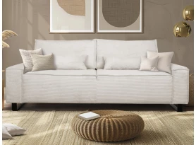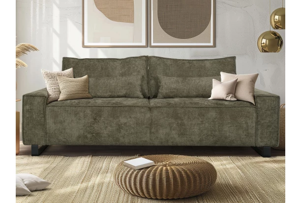 Moderní trojmístná pohovka je očalouněna sametově hebkou strukturovanou tkaninou v barvě olivově zelená. Pohodlné sezení na pohovce doplňují velké opěrné polštáře i bederní polštářky, které poskytují komfort a zároveň oporu. Černá kovová podnož umožňuje snadnou údržbu podlahy a případně i možnost využití robotického vysavače. Tento trojsedák se hodí do jakéhokoliv klasického nebo moderně zařízeného interieru.