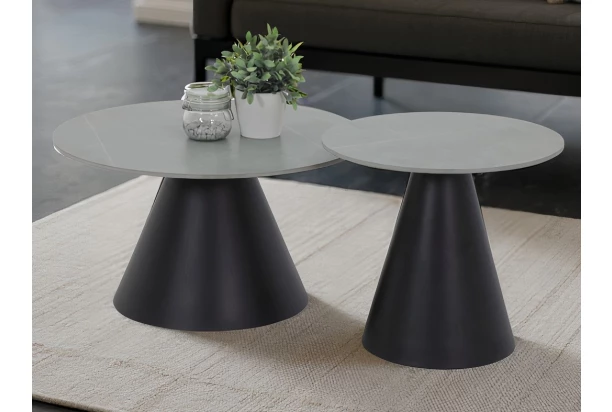 Tato sada obsahuje 2 různě velké kulaté stolky o průměru 70 cm a 50 cm. Stolky mají moderní design podle top aktuálních trendů a perfektně doplní moderní prostor vašeho obýváku. Kulaté stolky jsou vyrobeny v imitaci šedého mramoru v kombinaci s černou kovovou konstrukcí ve tvaru kuželu. Stolky lze využít jako společnou kompozici anebo samostatně – větší stolek můžete umístít k sedaččce a menší stolek například vedle sedačky pro odkládání věcí anebo kamkoliv do rohu místnosti pro umístění stolní lampičky, sochy či kytky. Záleží jen na vašem vlastním vkusu a prostorových možnostech jak s těmito stylovými stolky vynaložíte.