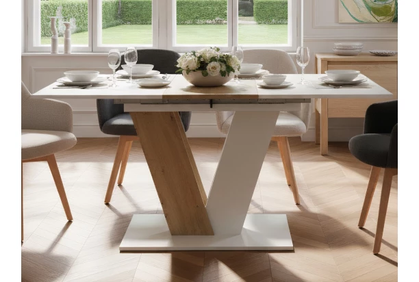 Malý moderní jídelní stůl má stabilní podnož ve tvaru V a zaujme na pohled. Obdélná jídelní plocha o velikosti 110×70 cm skvěle pasuje i do malého prostoru jídelny a díky synchronnímu rozkládacímu mechanismu lze rozložit na délku 150 cm – během chvilky tak budete tak moct pohostit více lidí. Tento obdélný stůl v moderním designu je vyroben v kombinaci bílé barvy s útulným dřevodekorem dub artisan – snadno tak bude pasovat k interierovému nábytku v bílém provedení i k nábytku v dekoru dřeva. Obdélná podstava zajišťuje dostatečnou stabilitu během každodenního užívání a vy si tak můžete vychutnávat vaše oblíbené jídlo.