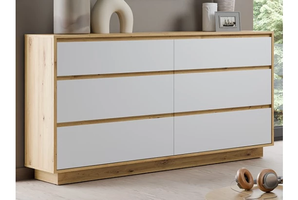 Komoda z kolekce Foggia – nábytek v moderním minimalistickém stylu kombinuje nadčasovou alpskou bílou s útulným dřevodekorem dub artisan, čímž vytváří harmonický celek vhodný do obývacího pokoje. Komoda má šířku 153 cm a nabízí kombinaci otočných dveří a zásuvek pro přehledné praktické ukládání věcí.