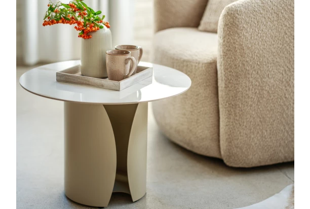 Konferenční stolek v moderním designu zaujme na pohled a zároveň působí luxusně vedle každé sedačky. Stabilní kovovou podnož v krémovém provedení doplňuje kulatá horní plocha o průměru 60 cm v imitaci leštěného světlého mramoru. Kulatý stolek tak skvěle doplní prostor moderně zařízeného obýváku.