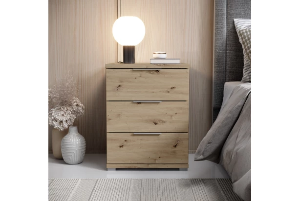 Noční stolek se 3 zásuvkami v moderním minimalistickém stylu působí nadčasově. Tento stolek k posteli má celkovou výšku 61 cm a je vyroben v dekoru dub artisan. Hodí se kombinovat k postelím s vyšším lůžkem.