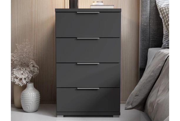 Vysoký noční stolek/skříňka se 4 zásuvkami v moderním minimalistickém stylu působí nadčasově. Má celkovou výšku 79 cm a je vyroben v grafitové barvě. Hodí se kombinovat k postelím s extra vysokým lůžkem, případně prakticky poslouží i jako samostatná skříňka kdekoliv v místnosti.