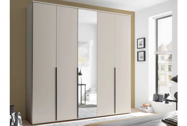 Šatní skříň se zrcadlem má celkovou šířku 225 cm a moderní styl se svislými úchyty. Tato skříň v barvě béžová kašmír za 5 otočnými dveřmi nabízí úložné prostory s šatními tyčemi a policemi. Skříň dobře poslouží v moderním prostoru ložnice, v šatně anebo komoře pro všestranné ukládání. Vnitřní prostory můžete navíc doplnit dalšími policemi v případě potřeby.