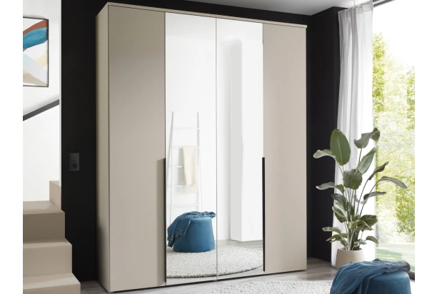 Šatní skříň se zrcadly má celkovou šířku 180 cm a moderní styl se svislými úchyty. Tato skříň v barvě béžová kašmír za 4 otočnými dveřmi nabízí úložné prostory s šatními tyčemi a policemi. Skříň dobře poslouží v moderním prostoru ložnice, v šatně anebo komoře pro všestranné ukládání. Vnitřní prostory můžete navíc doplnit dalšími policemi v případě potřeby.
