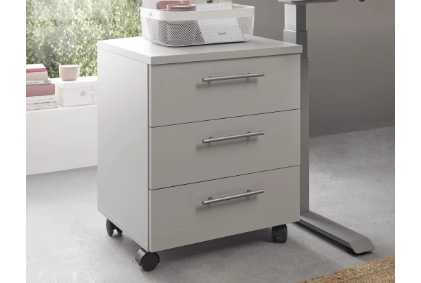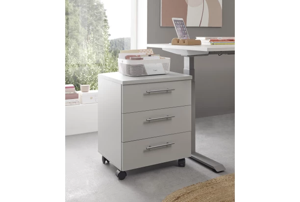 Univerzální úložný kontejner na kolečkách ve světle šedé barvě má 3 zásuvky a můžete ho umístit přímo k psacímu stolu anebo ho využít samostatně kdekoliv v místnosti jako malou úložnou skříňku. Kolečka s aretačním mechanismem udrží kontejner na svém místě.