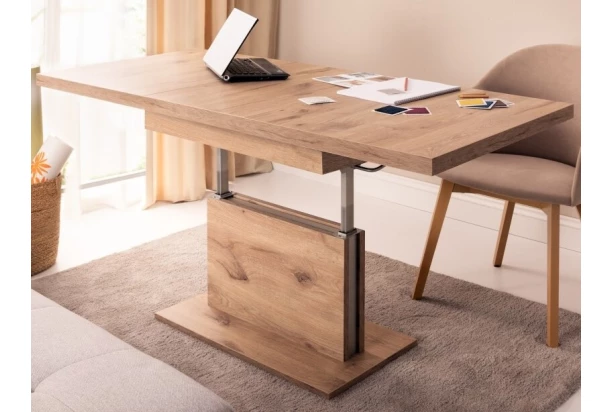 Univerzální a všestranný konferenční stolek s výsuvnou a výškově nastavitelnou deskou se snadno přizpůsobí vašemu interiéru. Můžete jej použít jako nízký konferenční stolek pro odpočinek, ideální pro odpolední čaj s kávou nebo jako velký jídelní stůl pro stolování s rodinou a přáteli. V případě potřeby jej také můžete rozložit pomocí skryté desky ve stole. Elegantní dřevěný dekor dub artisan vnese do obývacího pokoje útulnost a nadčasový vzhled, zatímco jeho chytrá konstrukce vám ušetří spoustu místa v prostoru.
