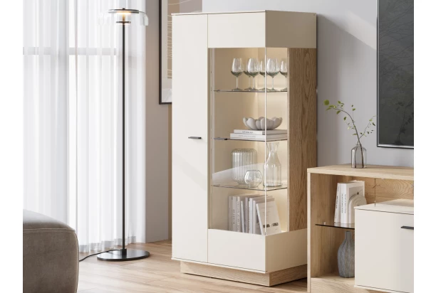 Vitrína z programu Meolo o šířce 75 cm je vyrobena v útulné kombinaci dub cremona/béžový kašmír. Elegantní částečně prosklená dvířka se 3 skleněnými policemi poskytují skvělé místo pro vystavení dekorací, fotek anebo skleniček. Praktický úložný prostor doplňují plná dvířka, za nimiž snadno uschováte vše, co chcete mít po ruce, ale ne na očích.