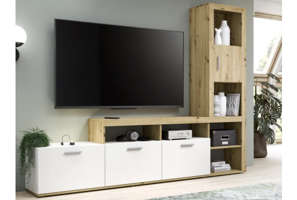 Moderní obývací stěna v dekoru dub artisan/bílá rozměrově pasuje do každého obýváku. Praktická kombinace vnitřních úložných prostor a otevřených přihrádek působí v prostoru obýváku vzdušně. Do vnitřních prostor můžete přehledně uložit drobné předměty a do přihrádek například dekorace, časopisy anebo třeba věci, které chcete mít stále při ruce.