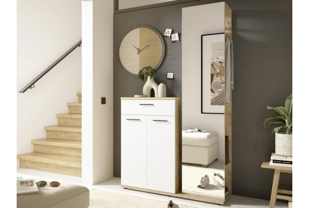 Kompaktní předsíňová stěna v moderním stylu a kombinaci dub evoke/bílá obsahuje vše potřebné, co v prostoru předsíně potřebujete mít. Sestava nábytku o celkové šířce 105 cm obsahuje vše potřebné – botník se zásuvkou, prakticky vysoké zrcadlo i šatní panel se závěsnou tyčí, kam snadno zavěsíte svrchní oblečení. Tato stěna bude dobře pasovat nejen do prostoru malé předsíně.