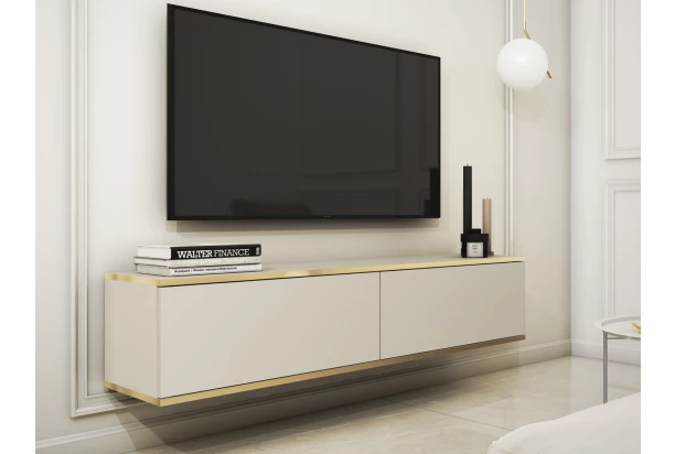 Závěsná TV skříňka o šířce 135 cm v béžové barvě skvěle doplní moderně zařízený interier. Plochy skříňky doplňují linie zlatého orámování, díky kterým působí luxusně. Tento stylový televizní stolek je navíc velmi praktický – díky zavěšení na zeď šetří prostor, usnaďnuje úklid podlahy a navíc působí v místnosti vzdušně. Ideální volba pro ty, kde hledají kombinaci funkčnosti a stylového designu.