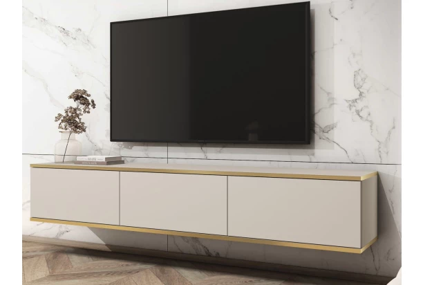 Závěsná TV skříňka o šířce 175 cm v béžové barvě skvěle doplní moderně zařízený interier. Plochy skříňky doplňují linie zlatého orámování, díky kterým působí luxusně. Tento stylový televizní stolek je navíc velmi praktický – díky zavěšení na zeď šetří prostor, usnaďnuje úklid podlahy a navíc působí v místnosti vzdušně. Ideální volba pro ty, kde hledají kombinaci funkčnosti a stylového designu.