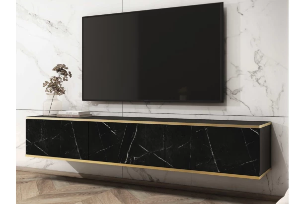 Závěsná TV skříňka o šířce 175 cm v imitaci černého mramoru skvěle doplní moderně zařízený interier. Plochy skříňky doplňují linie zlatého orámování, díky kterým působí luxusně. Tento stylový televizní stolek je navíc velmi praktický – díky zavěšení na zeď šetří prostor, usnaďnuje úklid podlahy a navíc působí v místnosti vzdušně. Ideální volba pro ty, kde hledají kombinaci funkčnosti a stylového designu.
