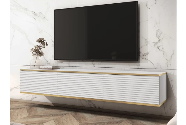 Závěsná TV skříňka o šířce 175 cm v bílé barvě skvěle doplní moderně zařízený interier. Plochy skříňky doplňuje zajímavá horizontální struktura a linie zlatého orámování, díky kterým skříňka působí luxusně. Tento stylový televizní stolek je navíc velmi praktický – díky zavěšení na zeď šetří prostor, usnaďnuje úklid podlahy a navíc působí v místnosti vzdušně. Ideální volba pro ty, kde hledají kombinaci funkčnosti a stylového designu.
